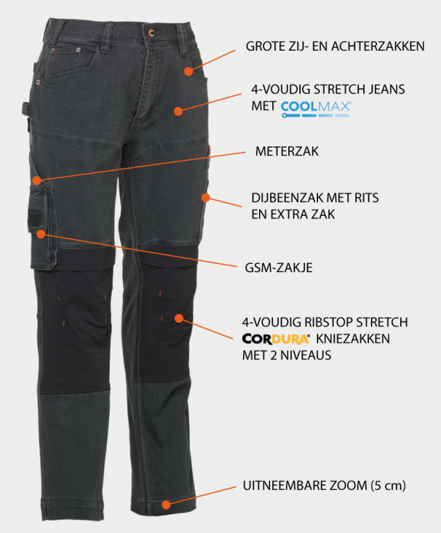 - Multi-pocket stretch jeans met Coolmax® en Thermolite® voor temperatuurregulatie